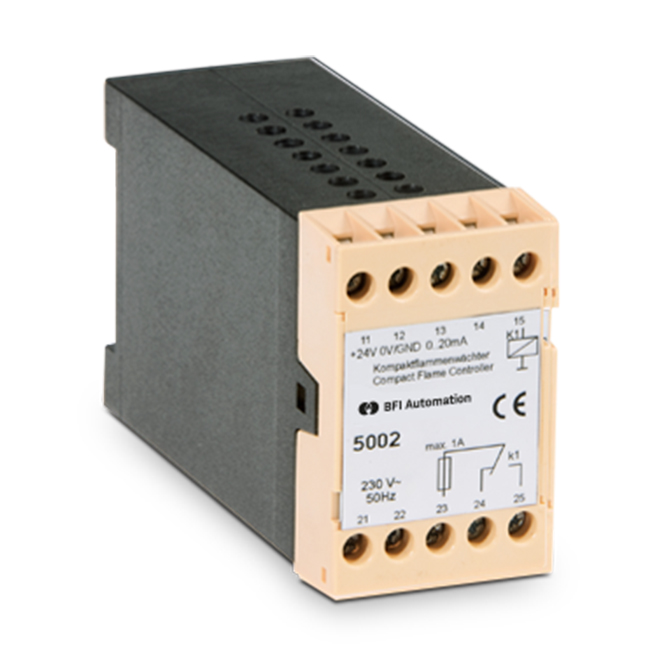 Das Kompaktflammenwächter-Netzgerät 5002 ist speziell zur Spannungsversorgung von allen BFI-Kompaktflammenwächtern konzipiert. Das integrierte Relais ermöglicht höhere Schaltspannungen und Schaltströme gegenüber den internen Relaiskontakten der Kompaktflammenwächter. Durch die geringen Abmessungen des Gerätes ist es besonders einfach durch Montage auf einer 35-mm-Tragschiene (Hutschiene) zu installieren.